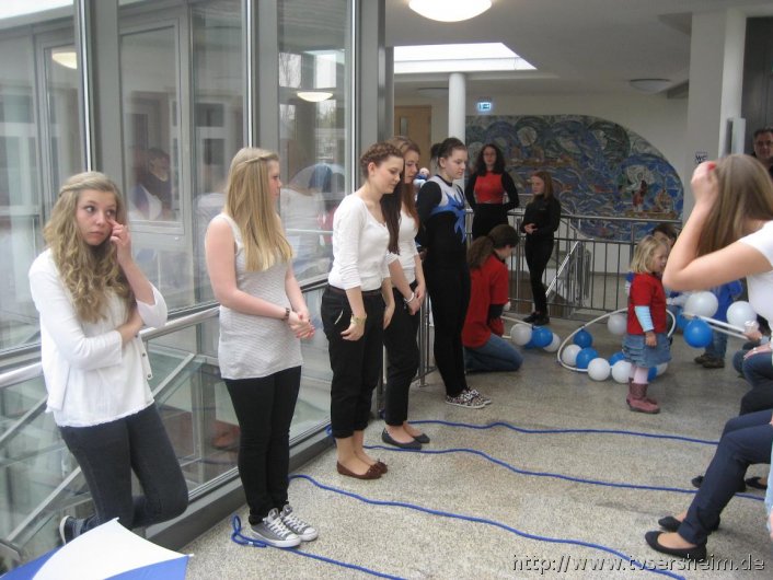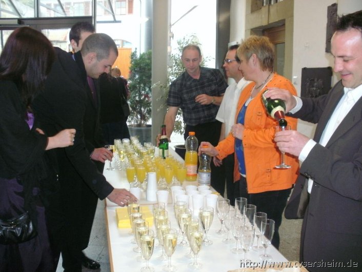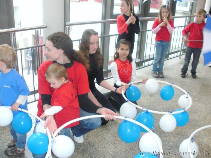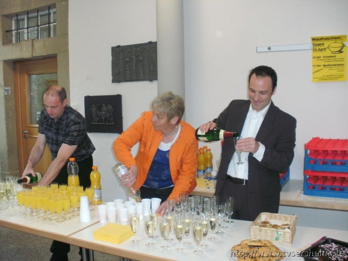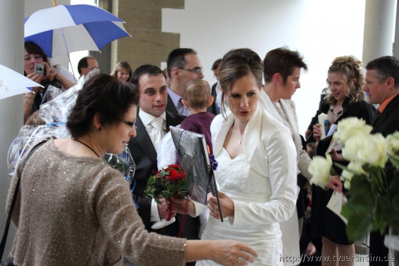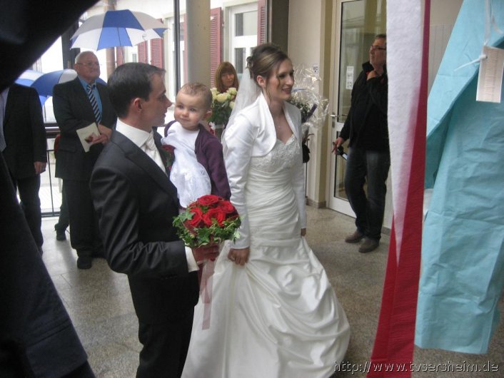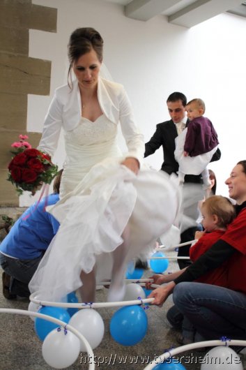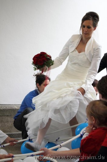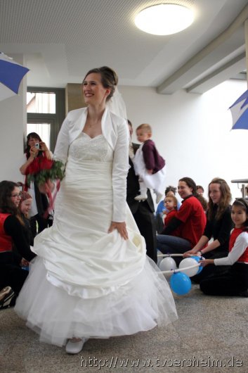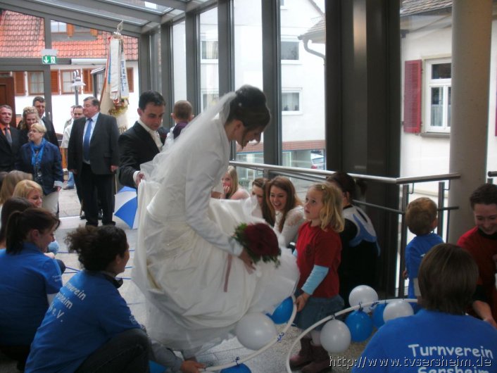 Nachdem die Gymnastikseile über- und die Gymnastikreifen durchstiegen und das Spalier der kleineren Gymnastinnen, die mit Regenschirmen in den TV-Farben blau-weiß ihre Trainerin im (kirchlichen) Hafen der Ehe begrüßten, durchschritten war, konnten die drei Hauptakteure des Tages ihre Glückwünsche vom TV und den zahlreichen weiteren Gästen entgegennehmen.