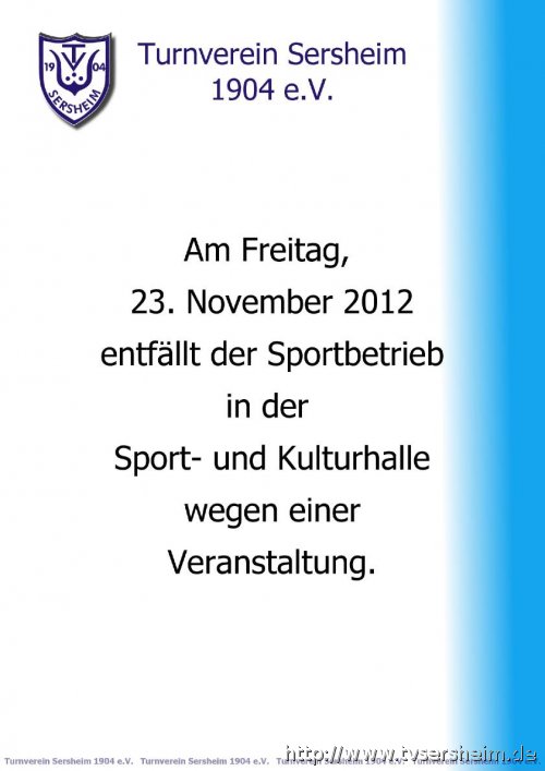 Am Freitag, 23. November 2012 entfällt der Sportbetrieb in der Sport- und Kulturhalle wegen einer Veranstaltung.