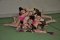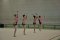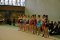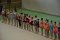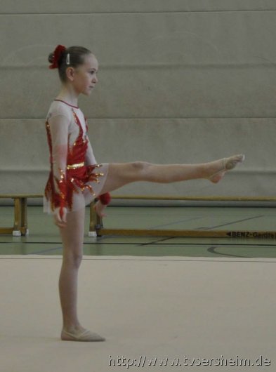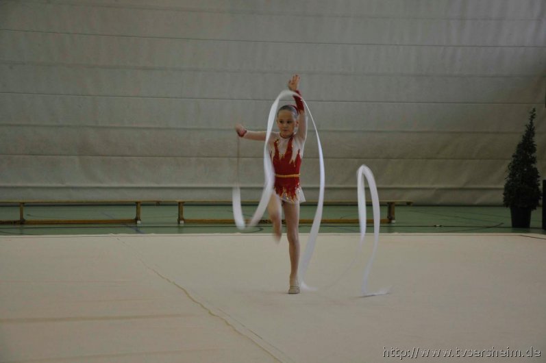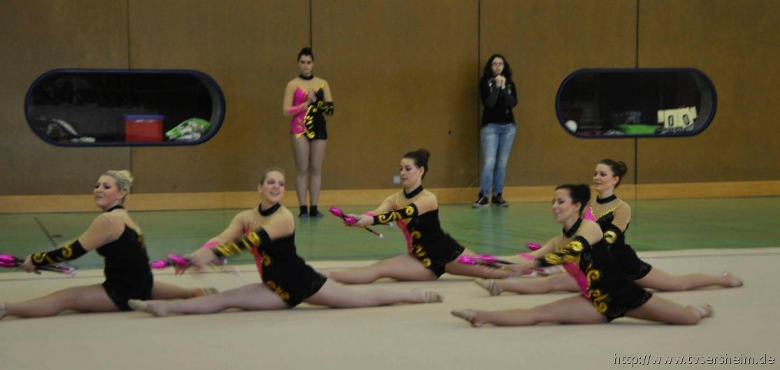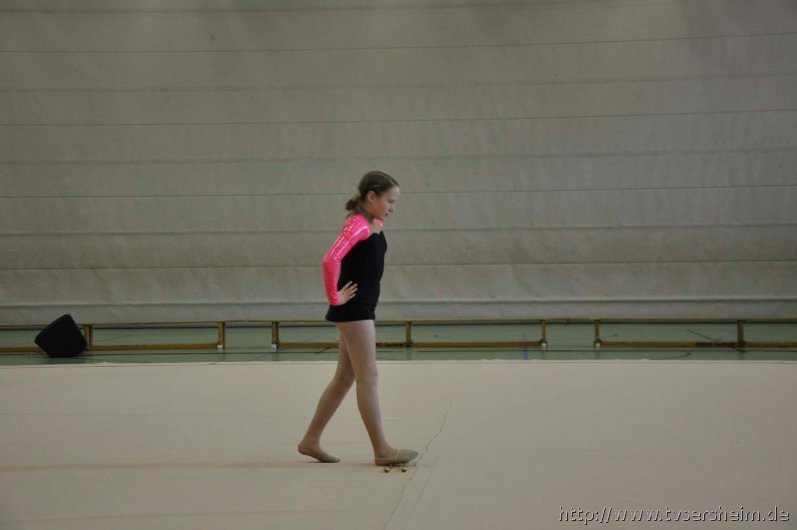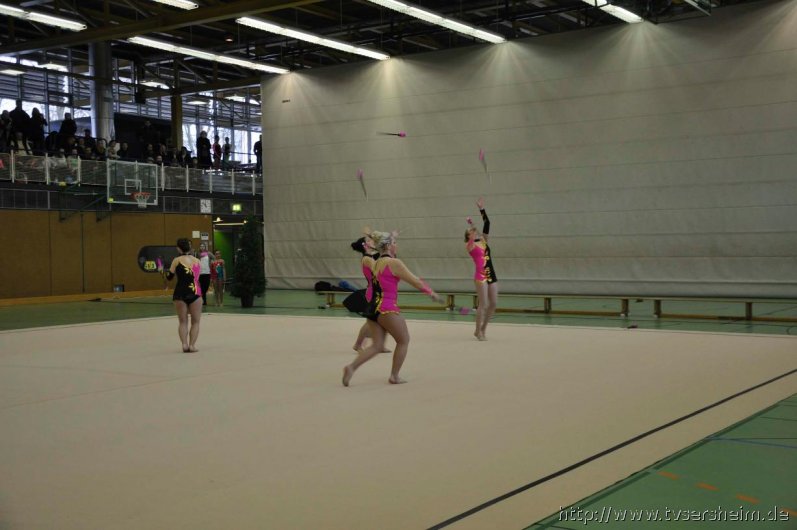 Gleichzeitig turnten die Mannschaften der K-Gruppe, in diesem Jahr konnte man zwischen den Handgeräten Band und Keulen wählen. Alle hatten sich für die Keulen entschieden. Ein wahres Feuerwerk war hier zu sehen, aber aufgrund der Nervosität und Unsicherheit gab es doch noch einige Handgerätverluste bei allen zu verzeichnen, so dass es sehr spannende war.