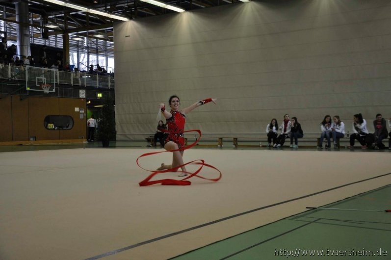 Nach der Siegerehrung starteten die Qualifikationswettkämpfe für den Deutschland Cup K-Einzel. Die Länge der Übung: 1:00 – 1:30 Minuten. Alle Übungen müssen mit Musik geturnt werden. Diese darf instrumental und/oder mit Gesang sein. In der K8 musste ein Zweikampf mit den Handgeräten Band und Keulen geturnt werden. In den Kürübungen mussten die vorgeschriebenen Pflichtelemente der K8 enthalten sein. Weitere Aspekte wie Choreographie, Musikumsetzung und Präsentation fliesen in die Wertungen ein. Mit 15 Teilnehmerinnen war hier das Teilnehmerfeld am stärksten. Einen deutlichen Sieg konnte Aylin Us vom TSV Schmiden für sich verbuchen, mit 29,300 Punkten. Sehr eng ging es bei den nachfolgenden Platzierungen zu. Platz zwei mit 27,750 Punkte Sultana Deligiannidou, TSV Schmiden, 3. Lisa Rotschen TV Mühlacker 27,550 Punkte, 4. Jule Brecht TSV Weinsberg 27,550 Punkte, 5. Sara Feeg 27,400 Punkte. Alle fünf konnten sich für den Regio Cup am Sonntag, 19. Mai 2013 anlässlich des Internationalen Deutschen Turnfestes 2013 qualifizieren. Dieser findet in der Nordbadenhalle 1 und 2, Ahornstr. 72, 68542 Heddesheim statt. Weitere Platzierungen: 6. Sophie Tutschke MTV Ludwigsburg 26,600 Punkte, 7. Christina Kitsaki TSV Schmiden, 8. Zenepe Redzepi TV Sersheim, 9. Katrin Birkicht TSV Weinsberg und Evelin Roth TSV Schmiden, 11. Felicia Baum TSV Weinsberg, 12. Lea Kocher MTV Ludwigsburg, 13. Amelia Siemianowska, 14. Milena Krauth, 15. Medina Redzepi alle TV Sersheim.
