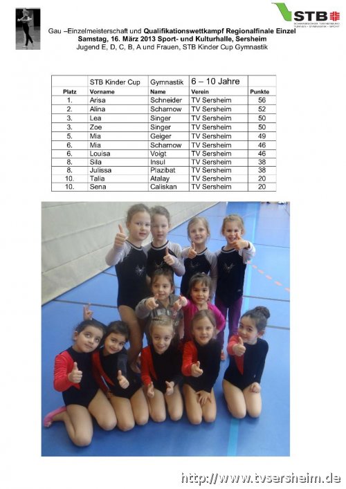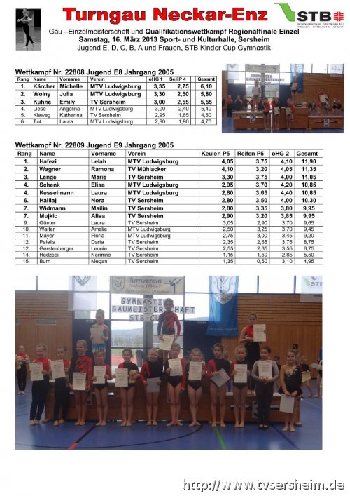 Im Rahmen der Gaueinzelmeisterschaft der Wettkampfgymnastinnen vom Turngau Neckar-Enz fanden am Samstag, 16. März 2013 die Gaumannschaftswettkämpfe, welche die Qualifikationswettkämpfe für das Württembergische Landesfinale der Mannschaften am 29. Juni 2013 in Sersheim waren statt.