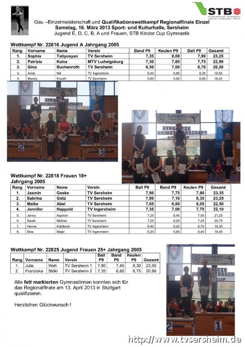 P6 bis zur schwierigen P9 auf die Pflichtmusik geturnt. Die besten drei Wertungen je Handgerät gingen in die Wertung ein. Die Siegermannschaft jeder Altersklasse qualifizierte sich für das Württembergische Landesfinale, welches am 29. Juni 2013 in Sersheim stattfindet.