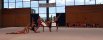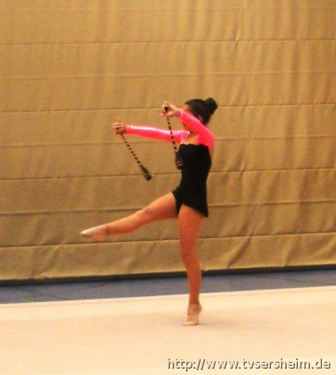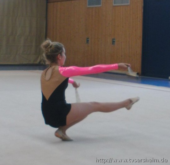 Den Übung lagen die Pflichtelemente der K8 sowie K6/K7 zu Grunde. Des Weiteren mussten Schwierigkeitselemente wie Sprünge, Drehungen und Stände in den Übungen sein. Geturnt wurde ein Zweikampf mit den Keulen und dem Band.