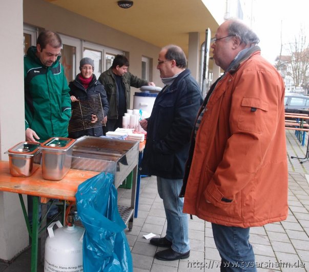 Bereits seit der Eröffnung des Hauses treffen sich am 24. Dezember Vorstände und Mitglieder einiger örtlichen Vereine im Haus am Schlösslesbrunnen. Auch 2013 waren Karin Geske (TV und Ehrenamtsbeauftrage im Haus am Schlösslesbrunnen), Gerd Langer (SKV), Gerd Max , Herbert Faigle (TC), Kay Borchert, Bernd Steinbach, Sieghard Geske (VfR) sowie Heike Bachert und Gerd Kurfiß (TV) im Einsatz zum Grillen oder Getränkeausschank. Kurz nach 10 Uhr starteten die Vorbereitungen, gemeinsam mit Hausdirektor Martin Suchaneck, Hauswirtschaftsleiterin Bettina Nägele, Ergotherapeutin Susann Hanisch sowie weiteren Mitarbeiterinnen und Mitarbeitern vom Haus am Schösslesbrunnen wurde aufgebaut und die letzten Dekorationen vorgenommen.