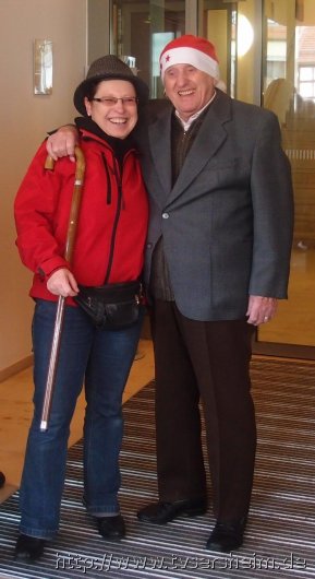 Ab 11 Uhr kamen die BewohnerInnen in den weihnachtlich dekorierten Mehrzweckraum oder gesellten sich zu den zahlreichen Gästen, die sich in und ums Pflegeheim aufhielten. Begrüßt wurden diese von Martin Suchaneck (Hausdirektor Haus am Schlösslesbrunnen), er bedankte sich bei allen Helfern, insbesondere bei Karin Geske, die er liebevoll schon zum Inventar zählte. Nach einem Weihnachtsgedicht von Eduard Mörike, welches Karin G. vorlas wurden im Mehrzweckraum Weihnachtslieder gesungen. Die Musikalische Begleitung übernahm Peter Kögler. Zum Mittagessen gab es gegrillte Rote Würste, Oberländer und Salat, dazu Glühwein oder Punsch. Wer mochte konnte noch Kleingebäck der obigen Vereine genießen.