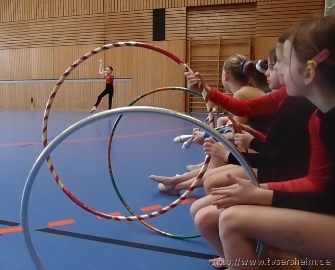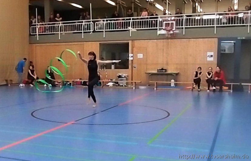 Dies waren gleichzeitig auch die Qualifikationswettkämpfe für das Regionalfinale sowie für das Landesfinale der Mannschaften. Die Teilnehmerinnen kamen vom MTV Ludwigsburg, TV Ingersheim und TV Sersheim. Los ging es um 10.30 Uhr mit dem Einturnen. Kurz nach 11 Uhr fand ein gemeinsamer Einmarsch und die Begrüßung durch Karin Geske, TV Verantwortliche und Turngauverantwortliche Fachgebiet Gymnastik statt. Es folgte ein kurzes Grußwort vom Turngaupräsident Gunter Bretschneider, der sich bei Karin und ihrem Team vom TV Sersheim recht herzlich für die tolle Organisation bedankte. Dann starteten die Wettkämpfe der Jugend C, B, A und Frauen, die einen Dreikampf mit den Handgeräten Band, Keulen und Reifen der Leistungsstufe P7 bis P9 auf Musik turnten. Es gab ab und zu Handgerätverluste und nicht alle waren zufrieden mit ihren eigenen Leistungen.Um 13.30 Uhr fand ein gemeinsamer Einmarsch mit den Teilnehmern des Nachmittags sowie die Siegerehrung der Wettkämpfe vom Vormittag statt.