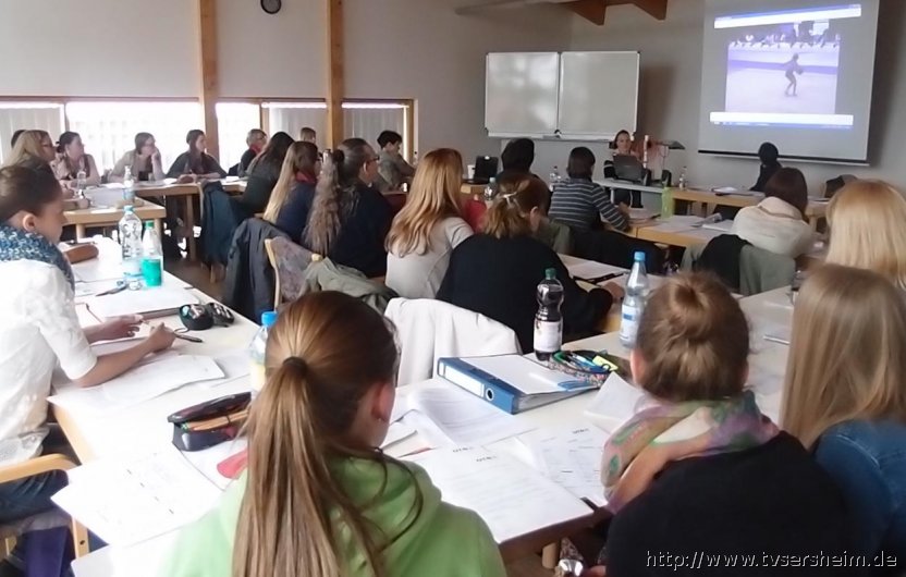 Weiter ging es mit Risikoelementen, Drehungen und Tanzschritten unter der Regie von den beiden Kampfrichterausschuss Mitgliedern Monika Biener und Meike Philipp-Ries. Das nächste Thema waren Sprünge, Stände und Beweglichkeit erkennen und aufnotieren von Körperelementen aus dem Schwierigkeitskatalog.