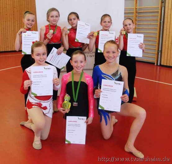 Am Sonntag, 04. Mai 2014 um 9.30 Uhr starteten die Wettkämpfe der D-Jugend. Die Gymnastinnen turnten einen Dreikampf mit den Handgeräten Band, Keulen und Reifen der Leistungsstufe P6. Gymnastinnen vom MTV Ludwigsburg und TV Sersheim hatten sich qualifiziert. In der D10 wurde Ramona Wagner mit 13,500 Punkte 2., Mailin Widmann belegte Platz 4 mit 13,150 Punkte beide TV Sersheim. Platz 5 ging an Elisa Schenk vom MTV Ludwigsburg mit 12,850 Punkten. Sehr spannend machten es die Mädchen der D11, hier kam es am Ende auf jedes Zehntel an. Noemi Pohlmann erturnte sich 13,900 Punkte und wurde Landessiegerin, Platz 3 mit 13,700 Punkte ging an Jasmin Tenzer, 4. Paula Kolb 13,600 Punkte, 6. Katharina Roth 13,300 Punkte alle TV Sersheim. Riesenjubel auch bei der Mannschaftssiegerehrung, sechs Team hatten sich qualifiziert. Das Team des TV Sersheim wurde Landessieger D10/D11 mit 41,150 Punkte und über einem Punkt Vorsprung. Es turnten Noemi Pohlmann, Jasmin Tenzer, Katharina Roth, Michelle Kuhne und Lina Brenner. Alle waren am Ende sehr zufrieden und freuten sich.