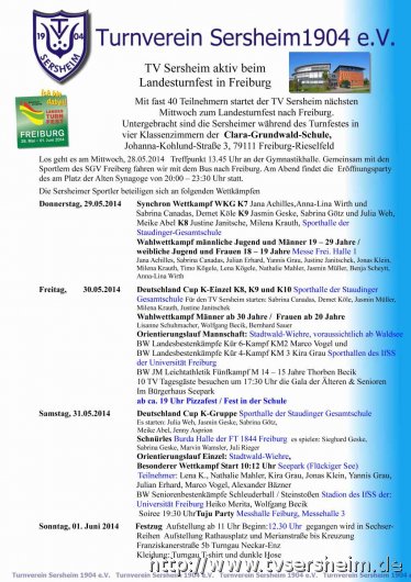 Los geht es am Mittwoch, 28.05.2014 Treffpunkt 13.45 Uhr an der Gymnastikhalle. Gemeinsam mit den Sportlern des SGV Freiberg fahren wir mit dem Bus nach Freiburg. Am Abend findet die Eröffnungsparty des am Platz der Alten Synagoge von 20:00 – 23:30 Uhr statt.