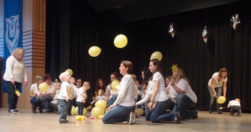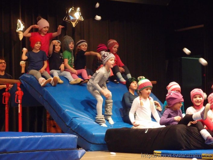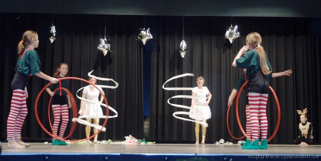 Die 4 – 6 jährigen Kinder aus dem Kinderturnen kletterten und balancierten unter dem Motto „Turnen in der Winterzeit“. Wilder Westen, so war das Motto der 5 – 9 jährigen Gymnastinnen und ihrer Übungsleiter, die mit Handgeräten und Tänzen über die Bühne wirbelten. Auf den Winterspielplatz luden die 2 ½ - 4 ½ jährigen aus dem Eltern – Kind-Turnen ein. Weiter ging es mit dem „Tanz der Weltmeister“. In Deutschland Trikots und mit vier großen Sternen präsentierten die Turn- und Tanzkids mit ihren Übungsleitern einen Tanz auf den Song Dare la la. Bei Sternenzauber zeigten die Turnzwerge ab 1 Jahr gemeinsam mit ihren Mamis Gymnastik mit selbstgebastelten Sternen und spielten anschließend mit Luftballons und Plüschsternen. Die 6 – 12 jährigen Turnerinnen und Turner luden ein zur Strandparty mit Wasserbällen und aufblasbaren Sommerutensilien und zeigten ihr Können unter der Leitung ihrer Übungsleiter und Helfer. Es folgten die „Wilden“ der Wettkampfgymnastik. Eine Mischung aus Wilde Hühner und Wilde Kerle, die Übungen mit Reifen, Keulen und Seilen präsentierten. Rollen wie ein Schneeball über schräge Weichbodenmatten und am Boden zeigten die 5 – 7 jährigen Kinder der Turnwerkstatt I. Auf den Song „Jump“ sprangen und hüpften die Turnerinnen der Fördergruppe über kleine Turnkästchen. Am Ende wünschten sie allen Gästen Frohe Weihnachten.