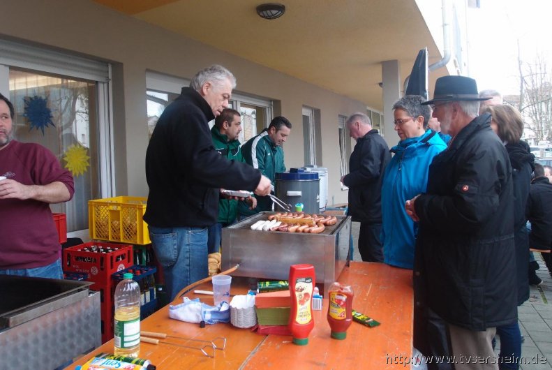 Bereits seit der Eröffnung des Hauses treffen sich am 24. Dezember Vorstände und Mitglieder einiger örtlichen Vereine im Haus am Schlösslesbrunnen. Auch 2014 waren Karin Geske (TV und Ehrenamtsbeauftrage im Haus am Schlösslesbrunnen), Gerd Langer (SKV), Gerd Max, Manfred Hetterich und Herbert Faigle (TC) sowie Kay Borchert, Bernd Steinbach, Sieghard Geske (VfR) sowie Heike Bachert und Gerd Kurfiß (TV) im Einsatz zum Grillen oder Getränkeausschank. Kurz nach 10 Uhr starteten die Vorbereitungen, gemeinsam mit Ergotherapeutin Susann Hanisch, die bereits am Tag davor mit Hauswirtschaftsleiterin Bettina Nägele und sowie weiteren Mitarbeiterinnen und Mitarbeitern aufgebaut und die letzten Dekorationen vorgenommen hatte.