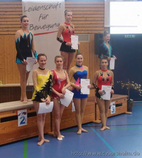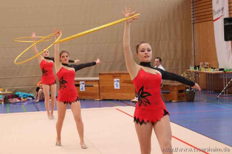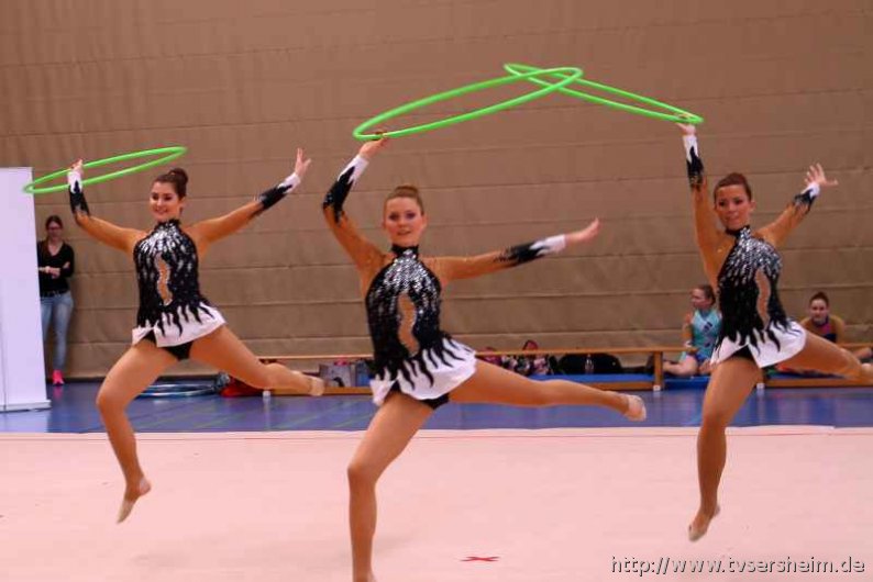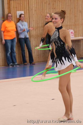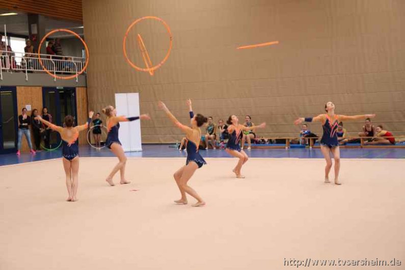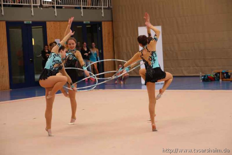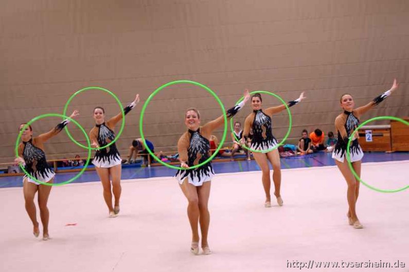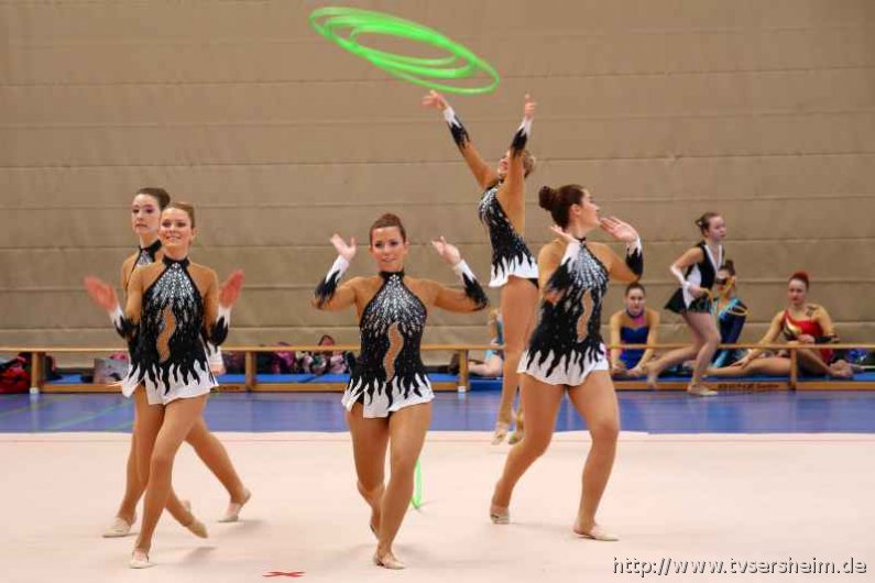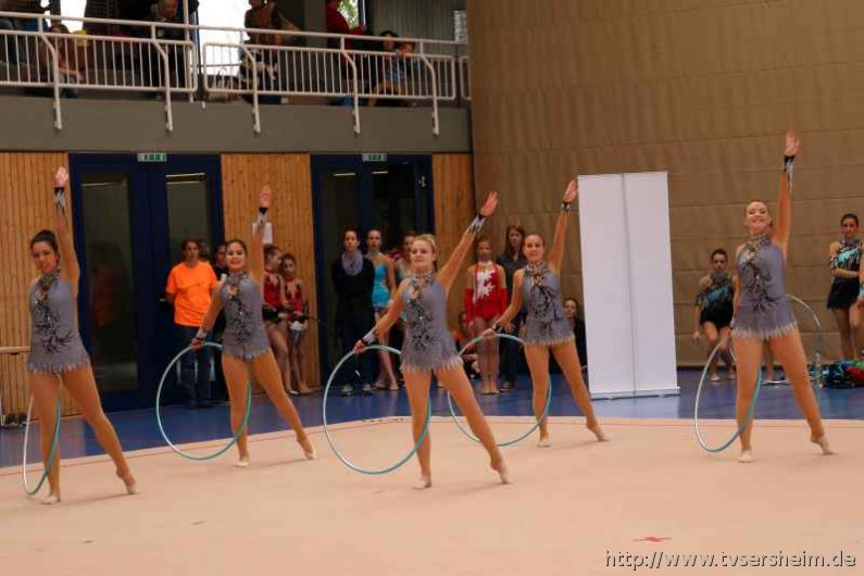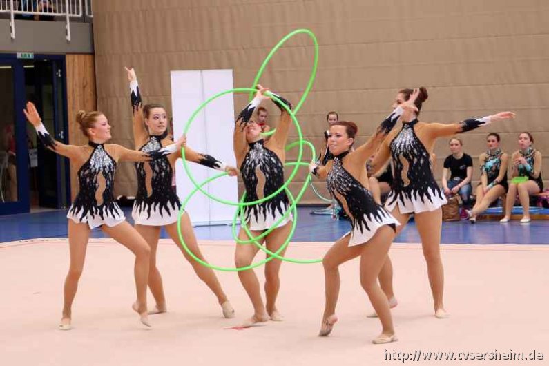 Bei der K Gruppe besteht ein Team aus 3 bis 6 Gymnastinnen ab 12 Jahre. Es kann eine Ersatzgymnastin gemeldet und variabel eingesetzt werden. Dieser Gruppengymnastik liegen die neuen Pflichtelemente der K8 zu Grunde. Alle Gruppen turnten das Handgerät Reifen. Die geforderte Übung, muss in zwei Durchgängen geturnt wird. Des Weiteren kommt die Harmonie, Synchronität und Präsentation dazu. Die Ergebnisse werden addiert und ergeben am Ende die Platzierung. Leider hatte das sonst so souveräne Sersheimer Team in beiden Durchgängen einige Handgerätverluste, aber auch den anderen Gruppen war die Spannung anzumerken so, dass es am Ende auf jedes Zehntel ankam. Am besten präsentierten sich hier die Truchtelfinger Kalinkas und belegten am Ende mit 29,265 Punkten Platz 1. Platz 2 ging an den TV Truchtelfingen mit 27,931 Punkten, dicht gefolgt vom TV Sersheim (Julia Weh, Jasmin Geske, Sabrina Götz, Sabrina Abel, Meike Asprion) mit 27,632 Punkte, 4. TSV Schmiden, 22,698 Punkte, 5. Platz Neueinsteiger TSV Großheppach 17,265 Punkte. Die zwei besten Gruppen qualifizieren sich für den Deutschland Cup Gymnastik K-Gruppe am 13./14. Juni in Neubrandenburg.