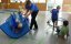 Weiter ging es dann an die Stationen. „Gespensterbälle“ mussten in die Wannen, Kisten und Schirme geworfen werden, hier war die Geschicklichkeit gefragt. Bei der Eule Eulalia hieß es: Klettere die Sprossenwand hoch und springe auf die Matte oder rutsche auf der Bank nach unten. Diese Übung diente der Armkräftigung und der Selbsteinschätzung. Bewegungsgeschicklichkeit sowie Förderung der Körperwahrnehmung war beim Krabbeln durch die Gespensterverstecke notwendig. Geschicklichkeit wiederum beim Klettern auf der Burgmauer. Nachdem alle Stationen absolviert waren, durfte noch nach Herzenslust getobt werden. Zum Mittagessen gab es Gespenstersuppe. Noch einmal ging es in die Halle um mit den selbstgebastelten Gespenstern zu turnen, bevor alle ihre Laufkarte erhielten und zufrieden nach Hause gingen.