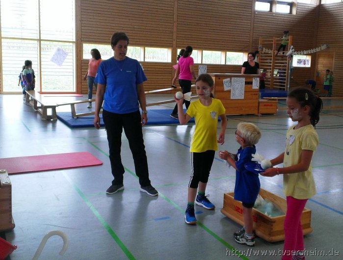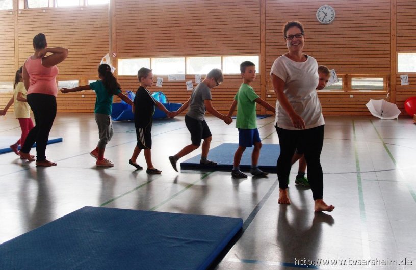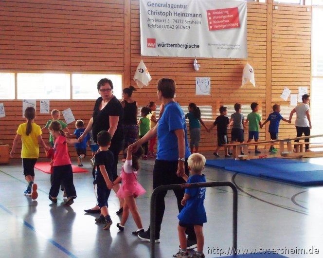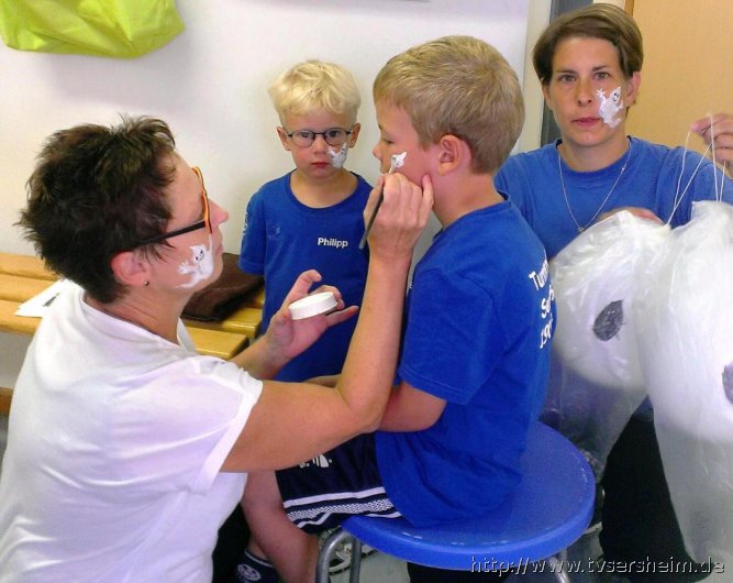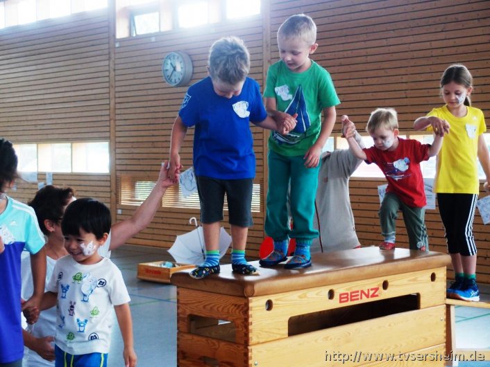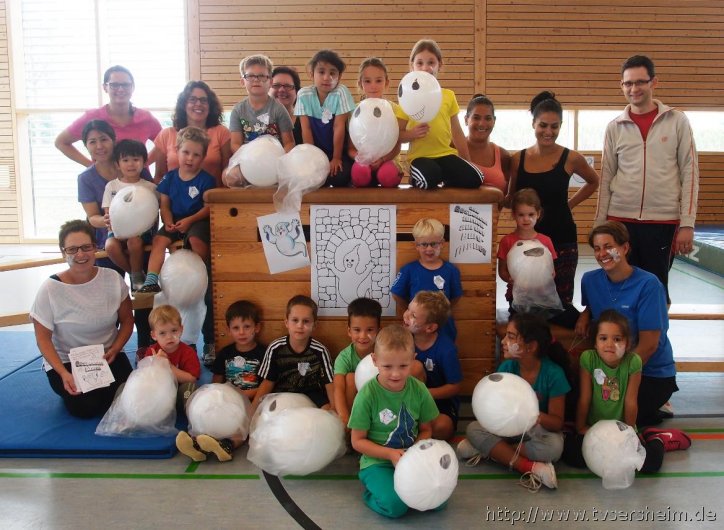 Gespensteralarm war das Motto des Sommerferienprogramms vom TV Sersheim am Donnerstag, 20. August 2015. Mit dabei waren Kinder von 4 bis 8 Jahren mit ihren Eltern. Zuerst wurde allen Kindern ein Gespenst auf die Wange geschminkt und jeder konnte sich ein Luftballongespenst basteln und am Ende auch mit nach Hause nehmen. Viel Spaß hatten die Kinder bei den Mitmach- Gespensterliedern. Danach ging es in die Gespensterbetten und immer wenn es 12 Uhr geschlagen hatte durften die kleinen Turnhallengespenster durch die Halle fliegen, rennen, hüpfen und springen. Danach gab es eine kleine Vesperpause mit Gespensterpizza und Gespensterkeksen sowie frischem Obst.