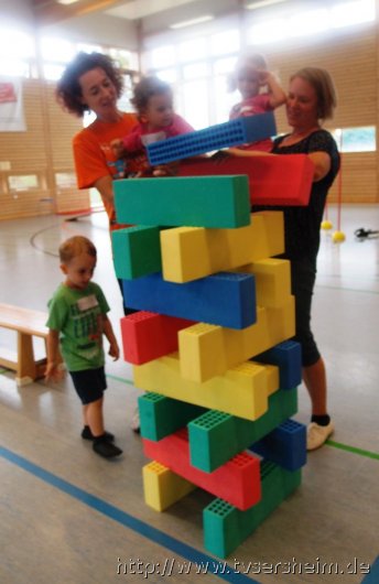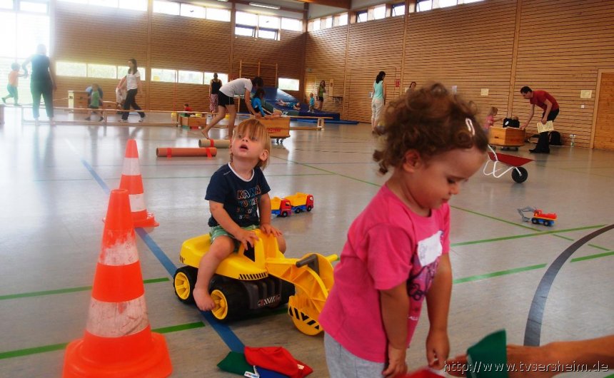 Nach einem gemeinsamen Lied ging es kreuz und quer durch die Halle. Beim Musikstopp-Spiel mussten verschiedene Übungen absolviert werden wie rollen am Boden, klettern an den Eltern oder „Hucke Pack-Tragen“. Nach einer kurzen Stärkung ging es an die aufgebauten Stationen. Mit Hilfe der Eltern konnten die Kinder auf dem Mattenberg nach oben krabbeln und nach unten rollen oder rutschen. Viel Spaß hatten die Kinder beim Mauer bauen und Bagger fahren. Ins Schwitzen kamen die Eltern beim Schieben mit der Schubkarre. Nach dem gemeinsamen Mittagessen konnten alle Kleinen mit ihrer Laufkarte und einem Bob der Baumeister - Trinkbecher müde und zufrieden nach Hause gehen.