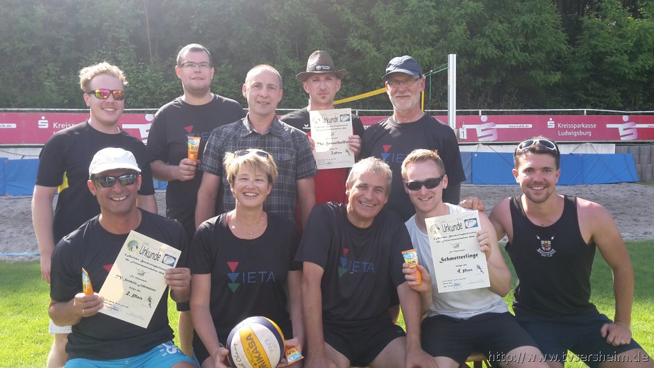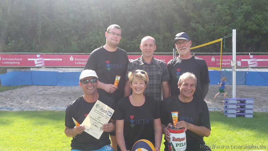 Trotz Regenvorhersage fand am Samstag den 18.06.2016 in Aurich das Beachvolleyballturnier für Freizeitmannschaften bei strahlendem Sonnenschein und Sommerwetter statt. Die Jedermänner und Jederfrauen des TV Sersheim belegten einen hervorragenden 2. Platz und setzten sich somit gegen den 3. platzierten TV Großsachsenheim durch, die mit 2 Sersheimer Spielern antraten. Unterlegen waren sie dem Vorjahressieger den "Schmetterlingen" die ebenfalls 2 Sersheimer in der Mannschaft hatten. Somit hatten alle 3 Podiumsplätze Sersheimer Beteiligung.