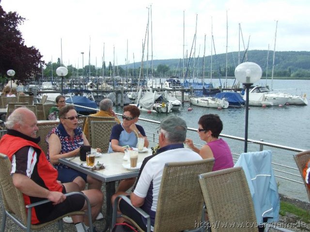 Am 2. Tag radelten wir nach Konstanz, wo wir gleich die Fähre nach Meersburg nahmen. Bei einem kurzen Aufenthalt konnte man durch die Altstadt schlendern. In der Nähe von Birnau machten wir in einem schönen Gartenlokal direkt am See unsere Mittagspause, bevor wir das Kloster Birnau besichtigten. Danach ging die Fahrt ging weiter durch Überlingen und Ludwigshafen nach Bodman, wo wir wieder direkt am See Kaffee, Torten und Eis genossen. Frisch gestärkt überwanden wir die letzten Kilometer nach Radolfzell.