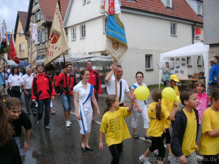 Anschließend ging es in einem gemeinsamen Umzug zum Stand der Turnabteilung. Hier gab es für alle 100 Gläser Freibier gespendet von der Firma Merker. Gemeinsam feierte man das Ereignis und plauderte mit vielen Sportkameraden.
