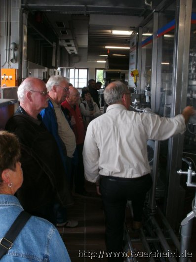 Danach ging es mit Arthur im Sudhaus weiter. Er informierte uns was alles zur Bierherstellung benötigt wird und welche Arbeitsgänge notwendig sind um Bier herzustellen. Vom Sudhaus ging es in den Hefe- und Gärkeller, vorbei an den Gärtanks von denen ein Tank 60 l fast. Weiter zum Lagerkeller mit ca. 35 Lagertanks. Der Tagesverbrauch liegt bei 28 000 l. Dann ging es in den Klär- und Filterkeller und von hier in die Abfüllanlage. In Bad Schussenried gibt es Flaschen mit Kronkorken sowie Bügelflaschen.