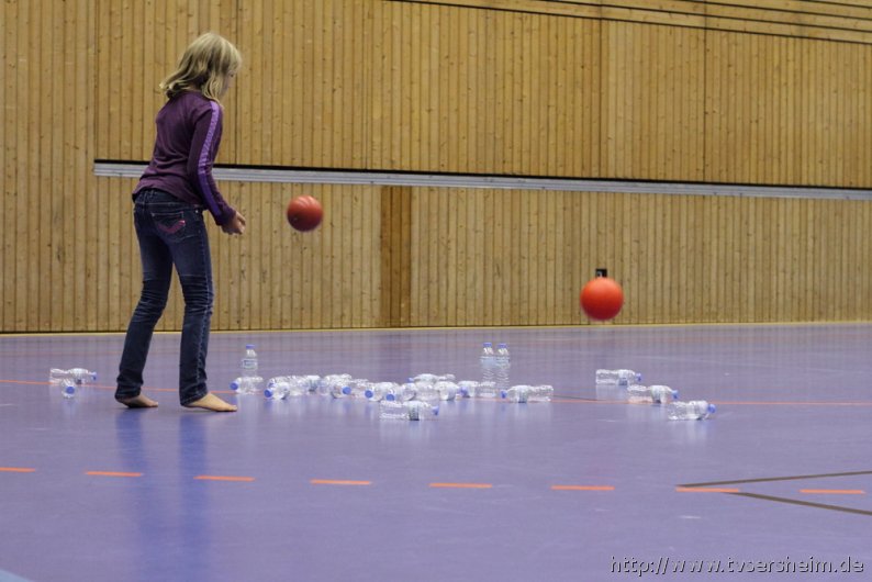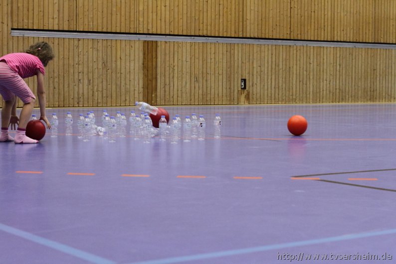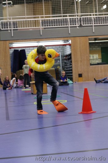Hier gab es die Stationen Flaschenkegeln und Flossenlauf mit Schwimmring durch einen Parcour. Am Ende spielten alle gemeinsam Brennball und Völkerball und kamen richtig ins Schwitzen.