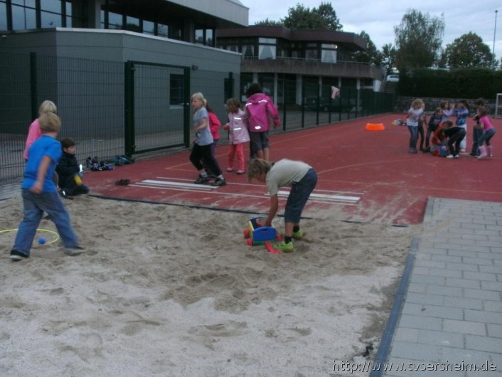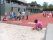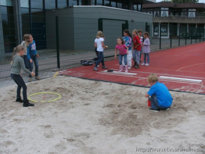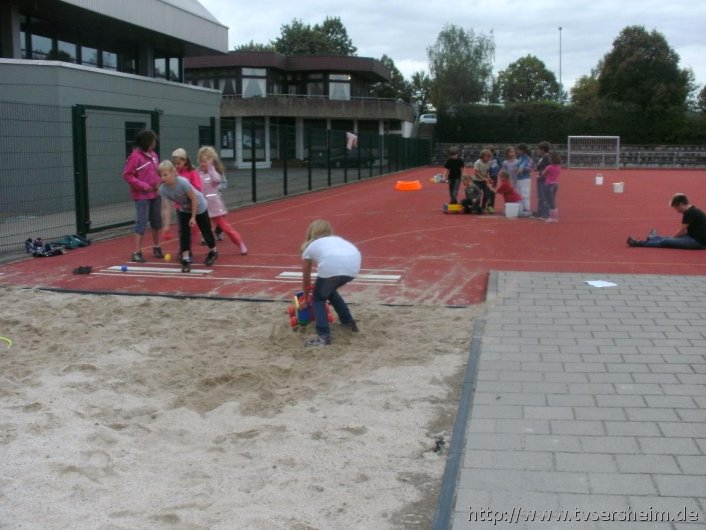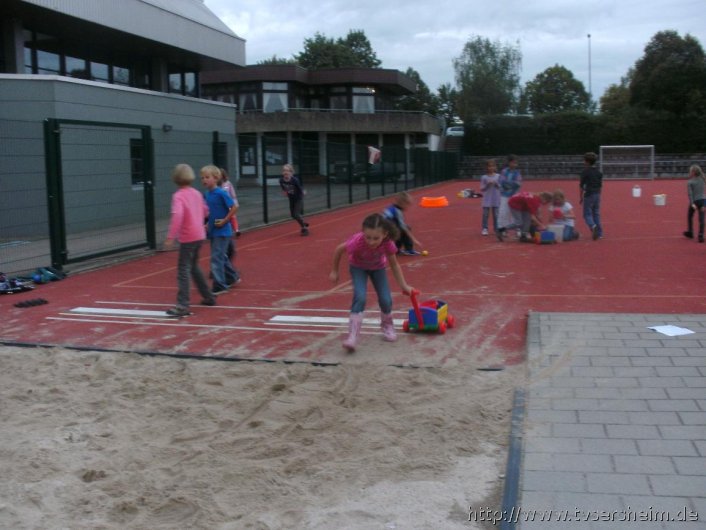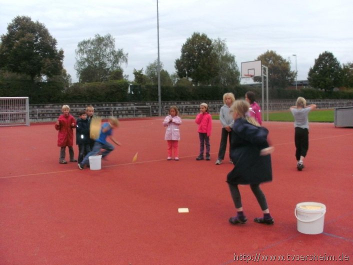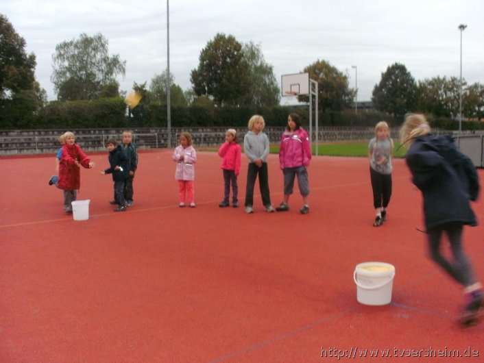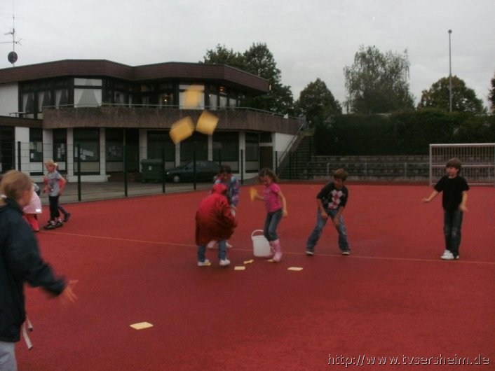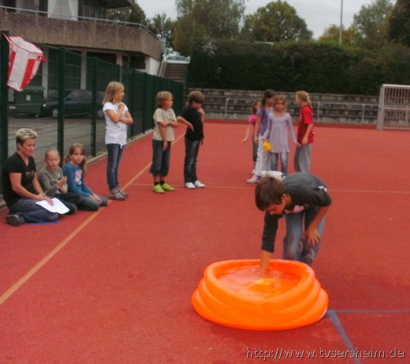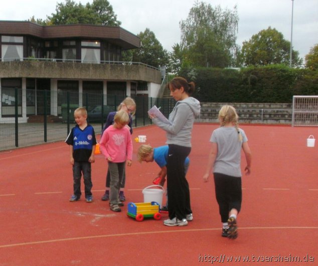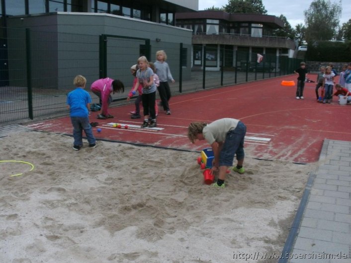 Nachdem Jeder sein Geschirr abgewaschen hatte ging es auf den Tartanplatz. Hier mussten in Fünfer Gruppen gemeinsam verschiedene Übungen bewältigt werden wie Bocciaspiel, Sand schaufeln, Schwämme werfen und Wasser tragen, dabei ging es lustig, feucht und sehr turbulent zu.