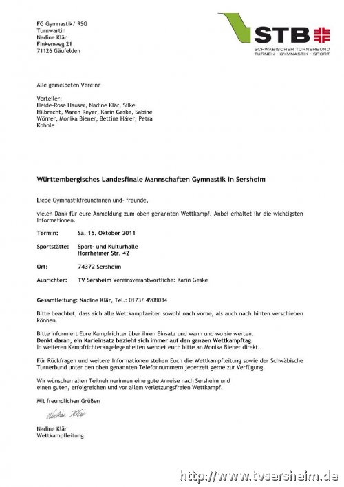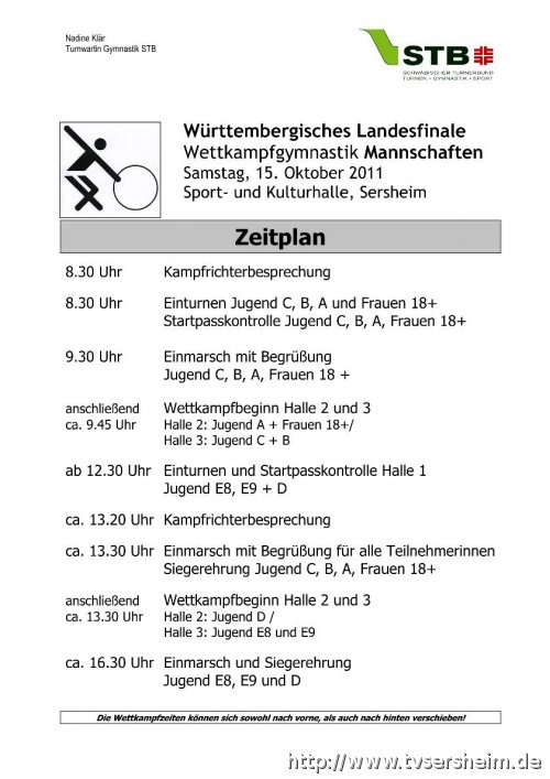 Am Samstag, 15. Oktober 2011 findet in der Sport- und Kulturhalle Sersheim das Württembergische Landesfinale für Mannschaften aus dem Fachgebiet Wettkampfgymnastik des Schwäbischen Turnerbundes statt.