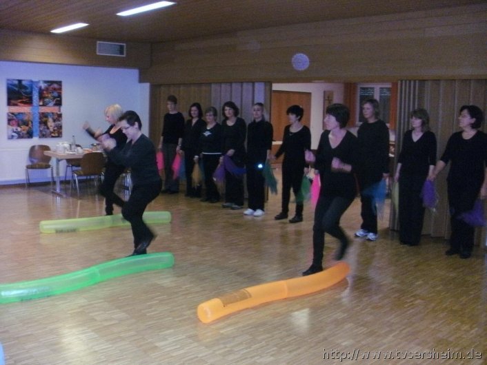 Danach startete das Programm. Das Motto des ersten Vorführblocks hieß „Farbenspiel“. Eröffnet wurde das ganze mit dem Gedicht „Ein Feuerwerk der Farben“, es folgte eine Vorführung der Sparte Bauch – Beine – Po sowie eine Gymnastik mit bunten Tücher von der Sparte Fitnessgymnastik Sport und Spaß am Vormittag unter Leitung von Karin Geske.
