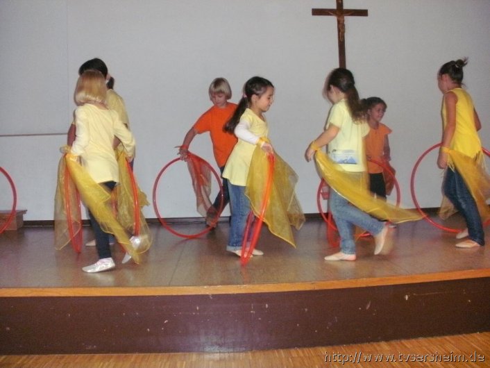 Beim Lied „Wir spielen mit dem Ball“ präsentierten die Turnzwerge wie sie den Ball rollen, werfen und schießen können. „Sonne scheine“ hieß es als die Gymnastinnen mit großen gelben und orangefarbenen Tüchern an einem Gymnastikreifen die Sonnenstrahlen auf und ab bewegten.