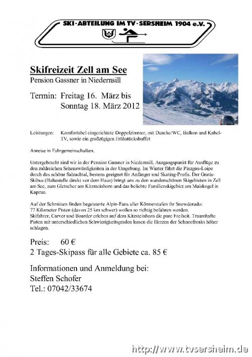Die Skiabteilung des TV Sersheim geht mit allen Interessenten vom 16 - 18 März 2012 nach Zell am See zur 2-tägigen Skiausfahrt.