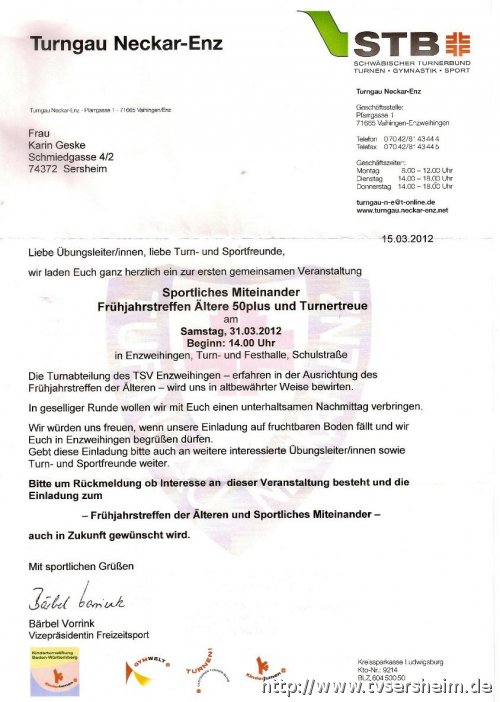 Frühjahrstreffen Ältere 50 plus und Turnertreue am Samstag, 31.03.2012 Beginn: 14.00 Uhr in Enzweihingen, Turn- und Festhalle, Schulstraße