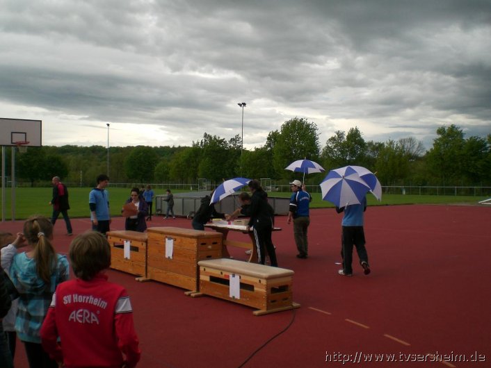 Nach Nieselregen am Morgen starteten die ersten Läufer der Altersklasse U8 und U10, bei bewölktem, aber trockenem Wetter, um 13.00 Uhr. Zeitgleich begannen die Wettkämpfe im Ballwurf sowie im Weitsprung.