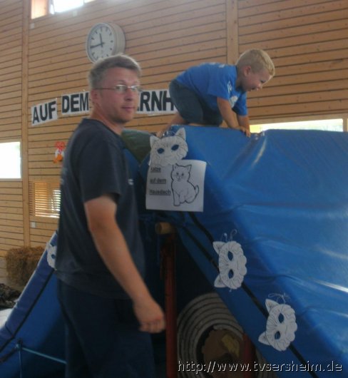 Am meisten Spaß hatten alle beim überwinden des Daches als Katze. Auf einer Seite mussten die Kinder an einer Weichbodenmatte nach oben klettern oder krabbeln und auf der anderen Seite wieder nach unten. Alles ging nach Zeit und man bekam Punkte.