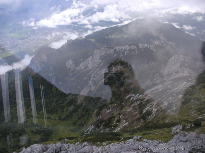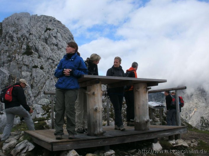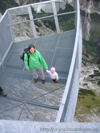Indessen war die Gruppe eins mit der Alpspitzbahn auf die in 2080 m Höhe, auf dem Osterfelderkopf gelegene Aussichtsplattform AlpspiX gefahren. Die Sersheimer staunten und hatten zum Teil Magenkribbeln. Die beiden 24 Meter langen begehbaren und freischwebenden Stahlarme des AlpspiX sind mit Gitterrosten ausgelegt und gewähren somit einen freien Blick in circa 1000 Meter Tiefe - passenderweise ins Höllental, wo man am Vortag wanderte. Noch einmal blickten die Wanderer auf die Wege ihrer Tour vom Vortag. Die Wanderung am Fuße der Alpspitze führte die Sersheimer dann entlang des Bernadeinsteiges über zahlreiche Steine, entlang an Heidelbeerbüschen in Richtung Kreuzeck. Hier ging es mit der Kreuzeckbahn zurück ins Tal.