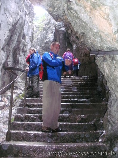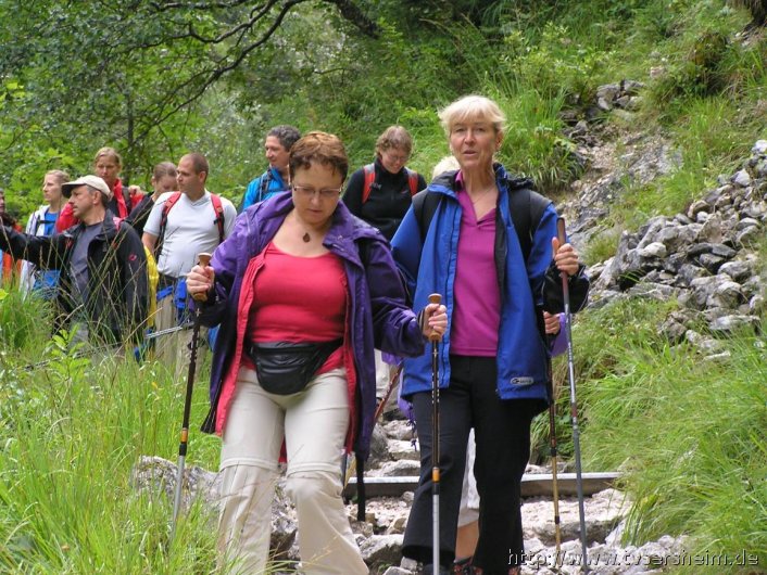 Tour 2 wurde an diesem Tag von Sieghard Geske geleitet, der mit seinen Wanderern in die Partnachklamm ging. Die sehenswerte Partnachklamm ist ca. 700 m lang, ihre Wände steigen bis zu 80 m empor. Man kann die Klamm über eine 68 m über dem Fluss gelegene eiserne Brücke überqueren, die 1914 angelegt wurde. Sie verbindet das Hausberggebiet mit dem Wamberg. Weiter ging es dann mit der Seilbahn hinauf auf den Wank, dem Panoramaberg von Garmisch-Partenkirchen in 1780 m Höhe. Hier wanderten die Sersheimer ca. 4 km rund um den Wankgipfel mit Ameisenberg und Rosswank und genossen die überwätigenden Rundblicke auf das Esterberg-, Ammer-, Karwendel- und Wettersteingebirge mit Alpspitze, Zugspitze und den markanten Waxensteinen. Mit der Seilbahn ging es wieder ins Tal, wo Busfahrer Siegfried Schreiter auf die Wanderer wartete. Nachdem er die Gruppe 1 abgeholt hatte ging es zurück ins Hotel und man konnte die Zeit zum Ausruhen oder einem Saunabesuch nutzen.
