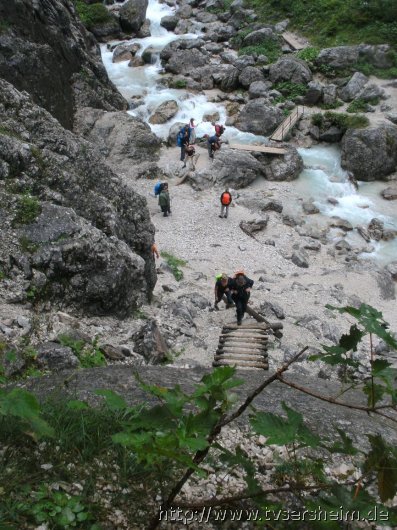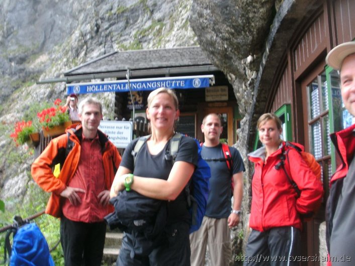 Vom Ausgangspunkt dauerte es ca. 1 ½ Stunden bis die Wandergruppe die Höllentaleingangshütte (1047 m) erreicht hatte. Hier ging es ca. 45 Minuten vorbei an zahllosen Wasserfällen, durch Felstunnel, über Stege, Felstreppen und durch Schluchten bis 150 m Tiefe. Am Ende der Klamm war man auf 1193 m. Weiter ging es bergauf bis zur Höllentalangerhütte (1387 m). Hier gab es erst mal trockene Kleidung und dann machte man gemütlich Brotzeit. Nachdem einige Sonnenstrahlen hervorkamen ging es auch schon wieder auf den sehr interessanten Rückweg über den Stangensteig, bei dem man die Schlucht nochmals über die „Eiserne Brücke“ in 73 m Höhe überquerte.