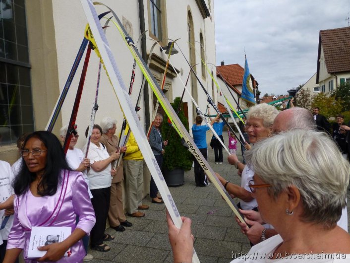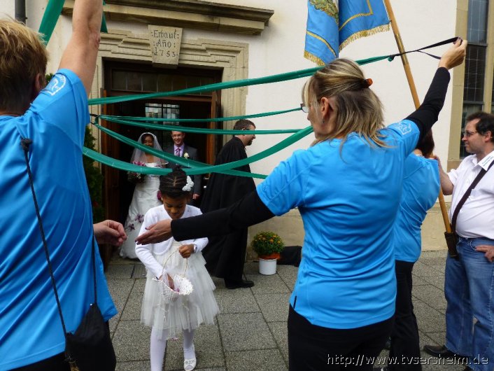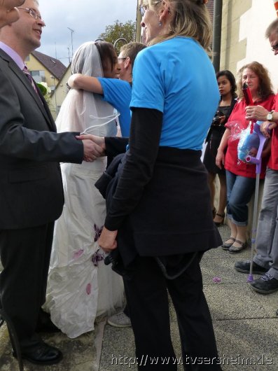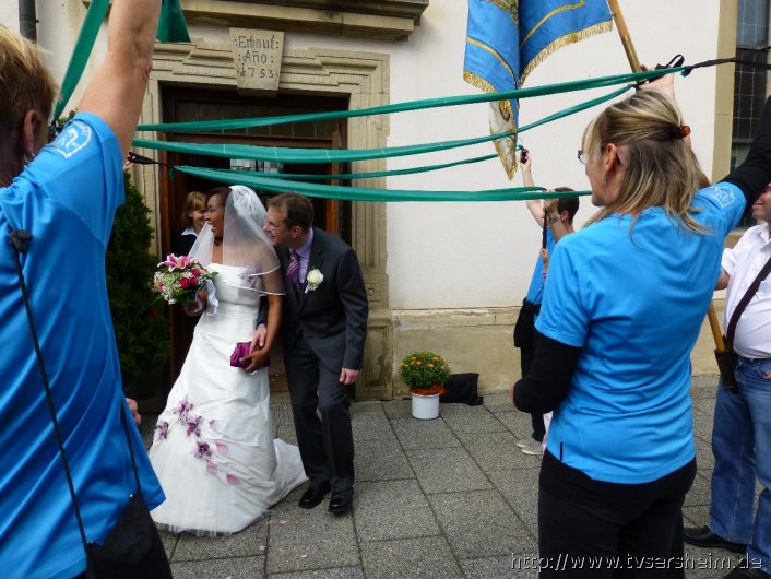 Nach der Trauung durften sie mit all ihren Gästen ein Spalier der Sportkameraden des TV Sersheim sowie der Bastler der Hobbygruppe Raketenmodelltechnik vor der Kirche passieren.