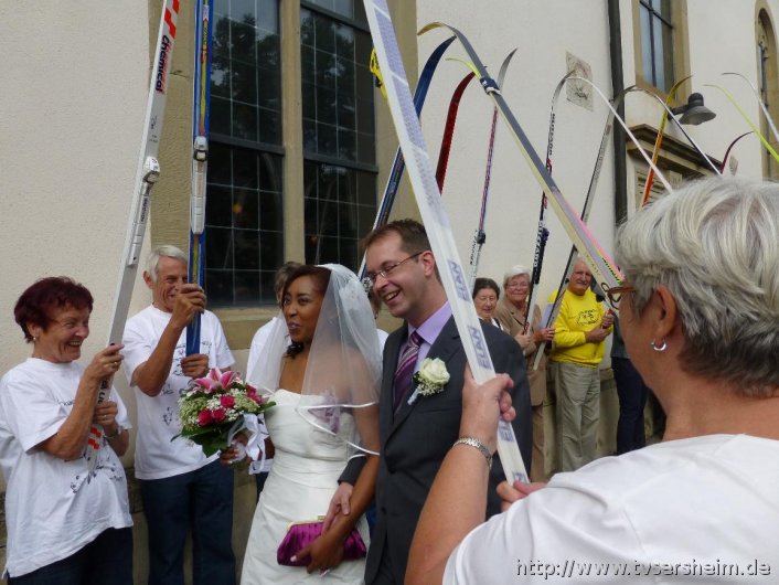 Mamisoa besucht seit 2012 die Fitgymnastik. Die anwesenden Fitgymnastinnen ließen das frisch vermählte Paar durch ein Spalier von Terabändern laufen, während die Skiabteilung, wie es sich für Skifahrer gehört, die beiden mit Skiern begrüßte.