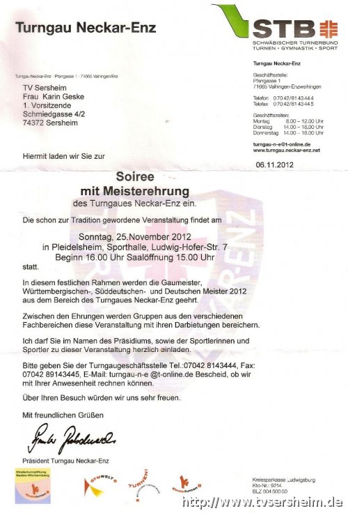 Am Sonntag, 25. November 2012 in Pleidelsheim, Sporthalle, Ludwig-Hofer-Str. 7 Beginn 16.00 Uhr Saalöffnung 15.00 Uhr