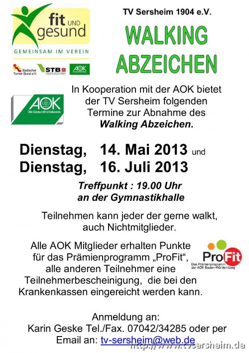 Das nächste Walking Abzeichen findet am 14. Mai sowie am 16. Juli 2013 statt. Teilnehmen kann jeder der gerne walkt, auch Nichtmitglieder.