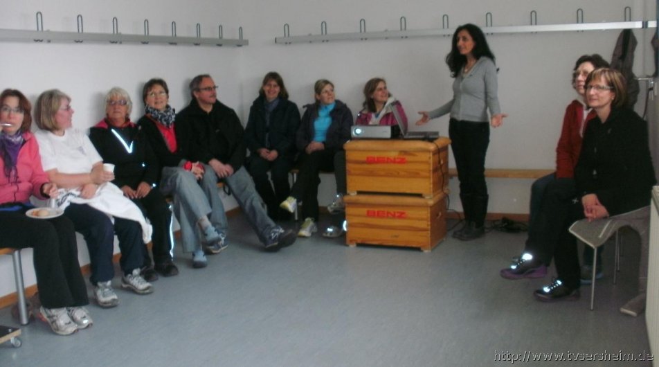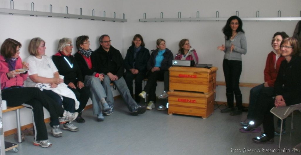 Um 10.15 Uhr machten sich die Teilnehmer gemeinsam mit Karin Geske auf den Weg. Es musste ein Stunde gewalkt werden. Gleichzeitig fand im Umkleideraum der Gymnastikhalle ein Ernährungsvortrag von der AOK Ernährungswissenschaftlerin Katayoun Emami statt. Emami Katayoun informierte sehr anschaulich mit einer Präsentation und kleinen Erlebnissen, wie wichtig bei der Ernährung Rituale sowie Obst, Gemüse und das Trinken sind.
