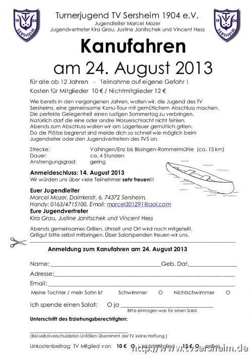 Wir haben noch freie Plätze bei unserer Kanufahrt auf der Enz am Samstag 24. August 2013. Schon jetzt freuen wir uns auf viele Teilnehmer und einen lustigen Tag. Anmeldezettel dafür findet ihr unten als Download. Der Jugendausschuss