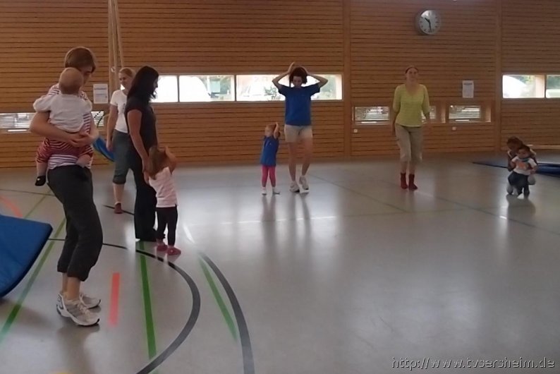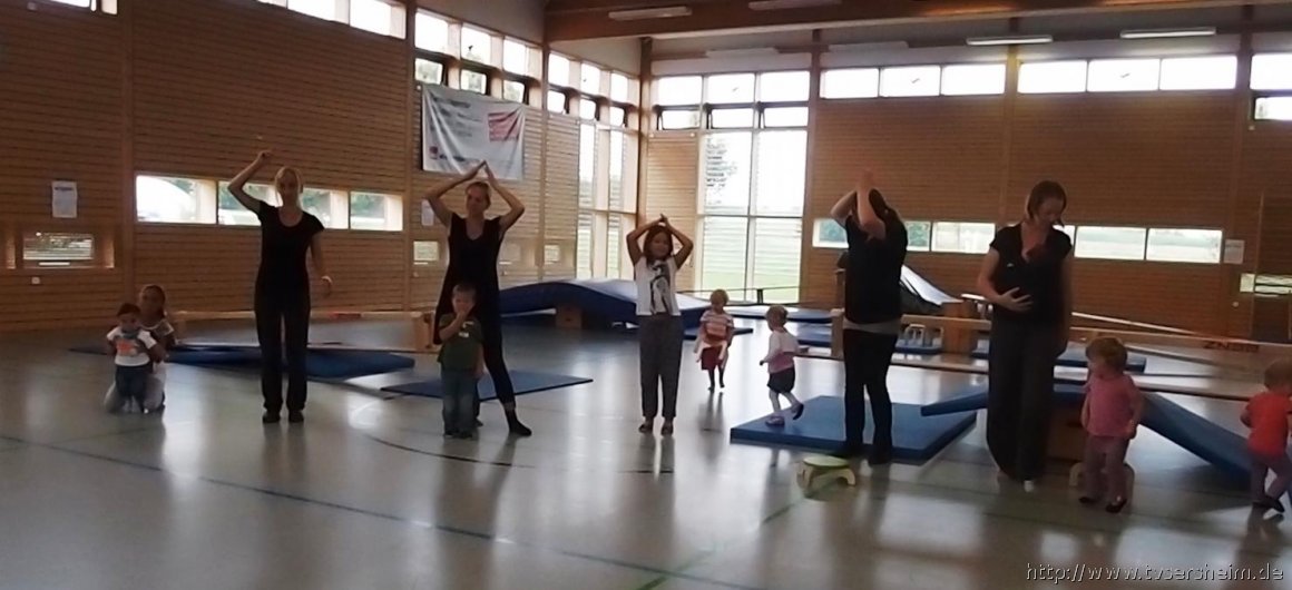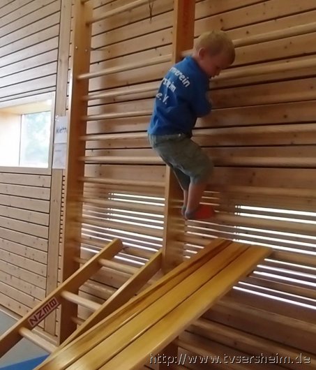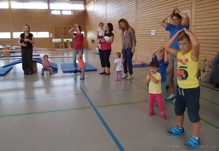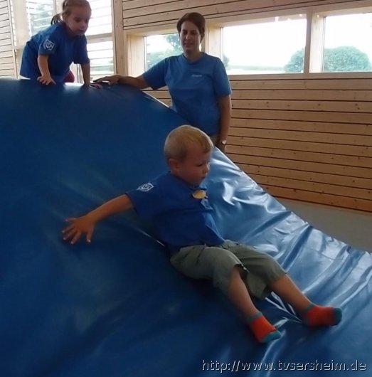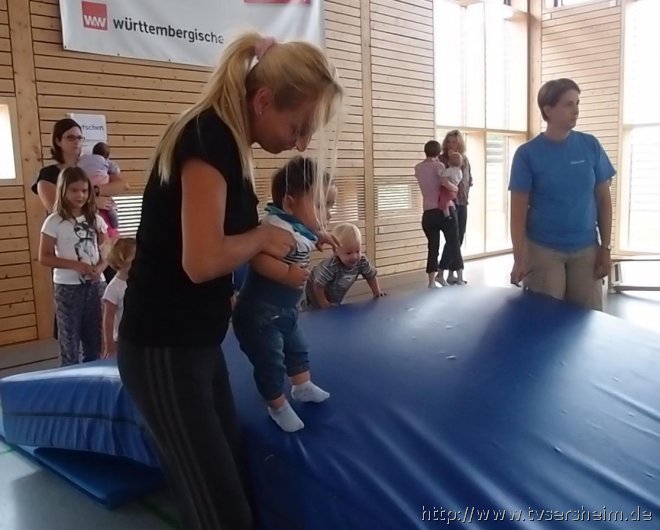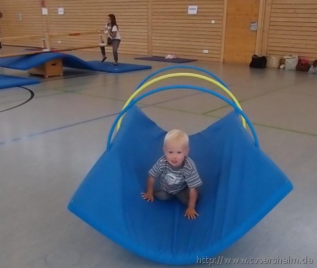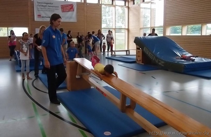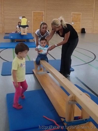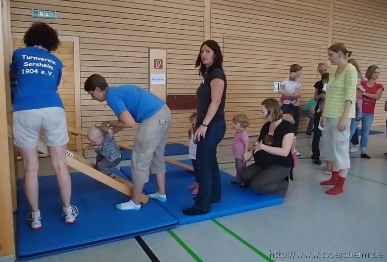 Am Freitag, 23. August 2013 hatte der TV Sersheim Kinder von 1 – 3 Jahren zum Sommerferienprogramm eingeladen. Kurz vor 10 Uhr wartete Karin Geske gemeinsam mit ihren Helfern auf die Mamis mit ihren Kindern. Alle erhielten ein Namensschild zum Bemalen und dann ging es in die Halle. Nach zwei Bewegungsliedern ging es an die aufgebauten Stationen. Zuerst wurde an der Sprossenwand und am Kasten geklettert, was den Kindern unheimlich Spaß machte. Weiter ging es an die Weichbodenmatten und Bänke zum Rutschen.