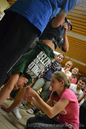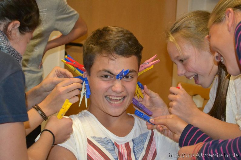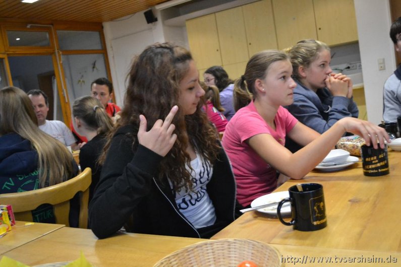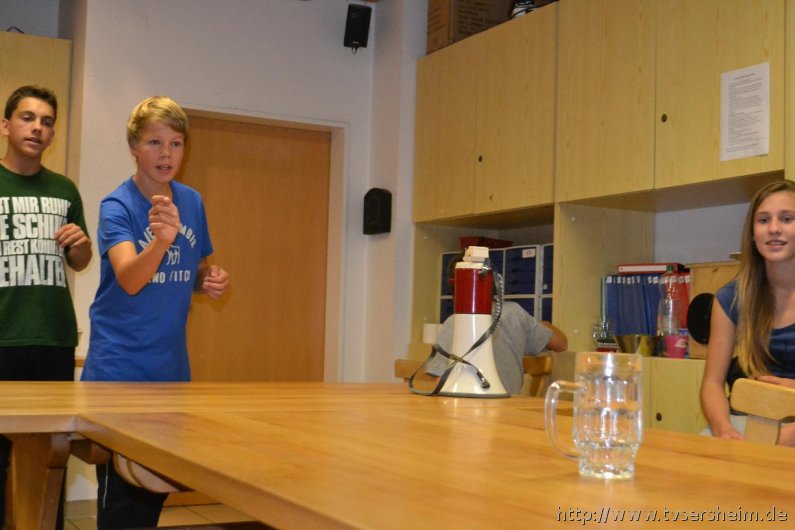 Am nächsten Morgen war das Wetter leider wie ausgewechselt. Es goss wie aus Kübeln, sodass das Programm spontan geändert werden musste. Anstatt draußen Baseball zu spielen, wurden im Aufenthaltsraum kleine Gemeinschaftspiele gespielt. Mittags wurde dann das Programm trotz des anhaltenden Regens wie geplant durchgezogen. Bei der Schnitzeljagd durch Untersteinbach gab es allerdings kleinere Komplikationen, da der Regen die Kreide zum Teil weggewischt hatte. Nach dem Abendessen fand dann dass Abendprogramm statt. Gespielt wurde ‚Mein Team kann‘, angelehnt an die Fernsehshow ‚Mein Mann kann‘. Die Zeit verflog wie im Flug und so stand nach alles anderen als langweiligen fünf Stunden, das Siegerteam fest. Leider regnete es draußen immer noch, deshalb musste das gemütliche Sitzen am Lagerfeuer nach drinnen verlagert werden – selbstverständlich ohne Feuer.