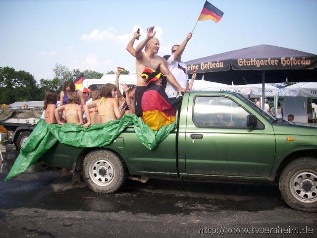Mittags wurden zudem kurzerhand zwei Pritschenwagen organisiert, bei denen die Pritsche mit einer Plane ausgelegt und zum erfrischenden Bad umfunktioniert wurde. Mit Sonnenschirm darüber ließ es sich hier gut aushalten, bis es um 16 Uhr in der WM-Lounge hieß: Deutschland gegen Argentinien. Die Stimmung war gut- 4:0 hieß das allerseits bekannte Endergebnis.