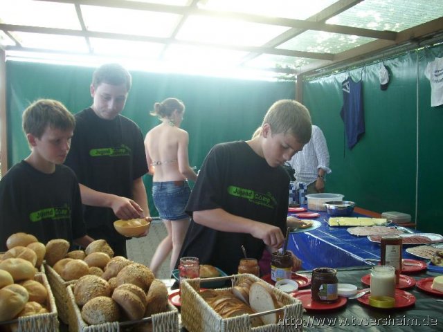 Sonntagmorgens wurden alle um 6 Uhr geweckt, da Regen und Gewitter den Zeltplatz heimgesucht hatten. Daher wurden alle in die Gymnastikhalle evakuiert, wo natürlich kaum einer mehr Schlaf fand. Da kurzer Zeit die Gewitterfront weiterzog, standen alle pünktlich um 8 Uhr beim Frühstück.